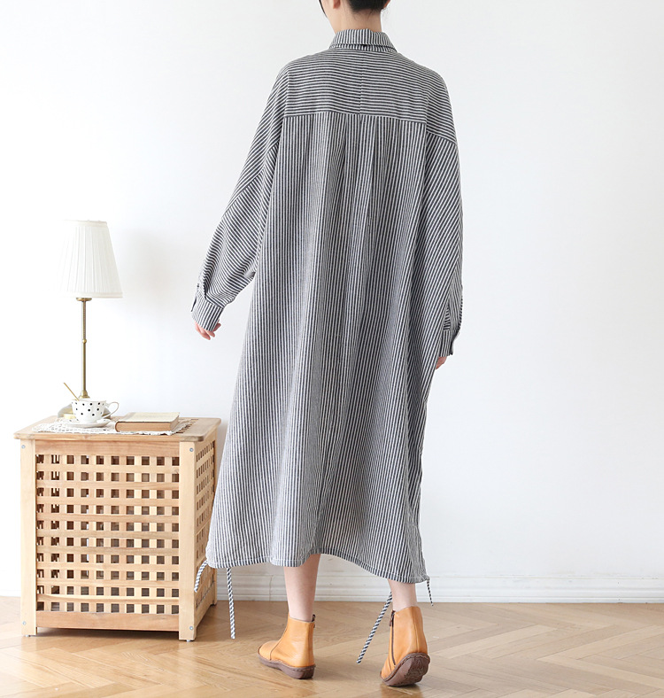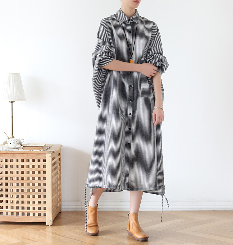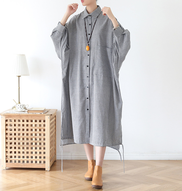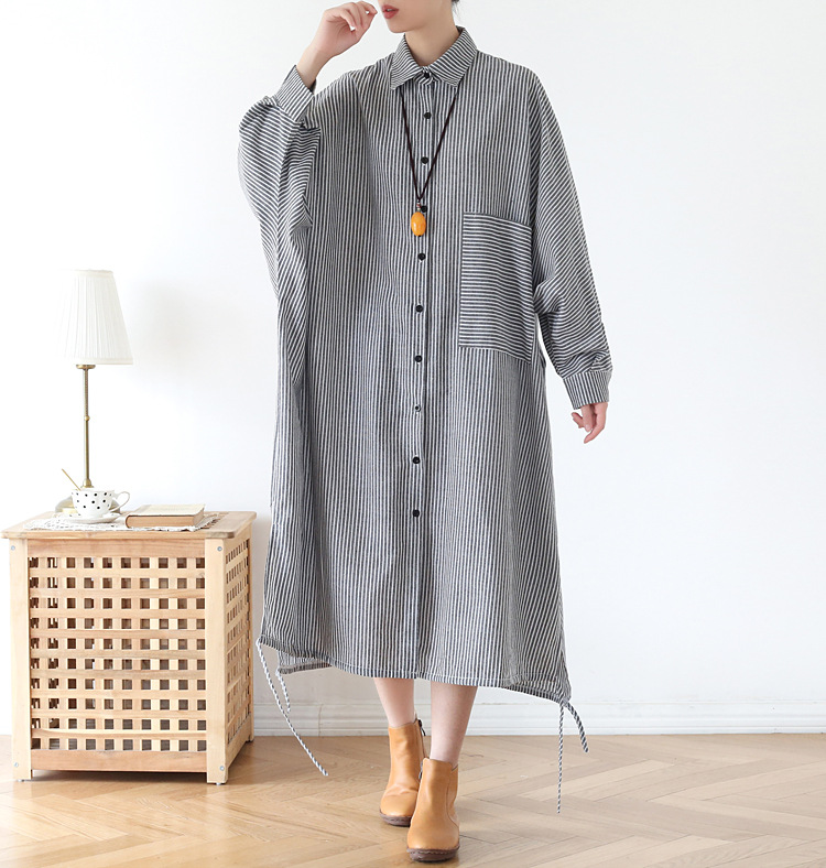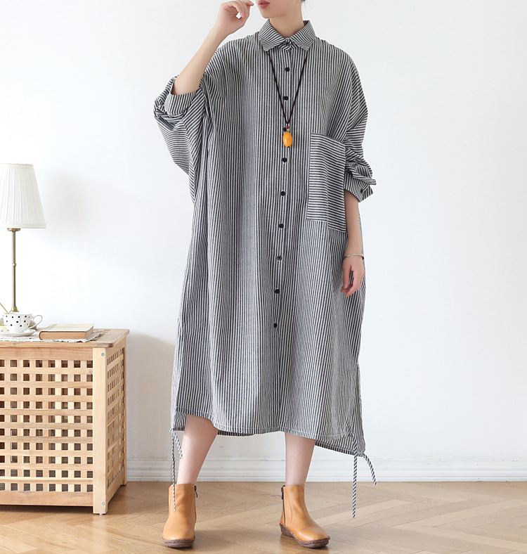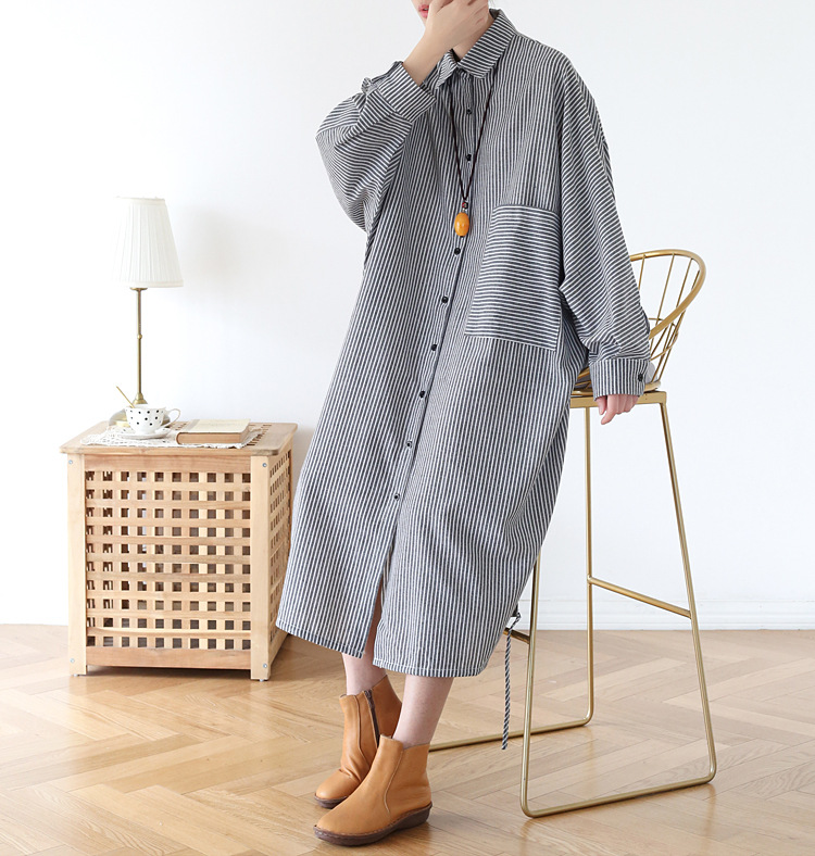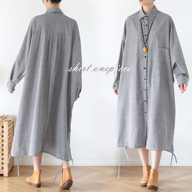 上品なストライプ柄のシャツワンピースで、ゆったりとしたシルエットが体型をカバーしながら着痩せ効果を演出します。