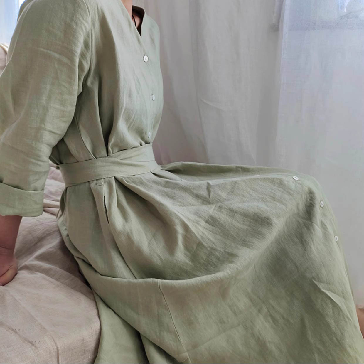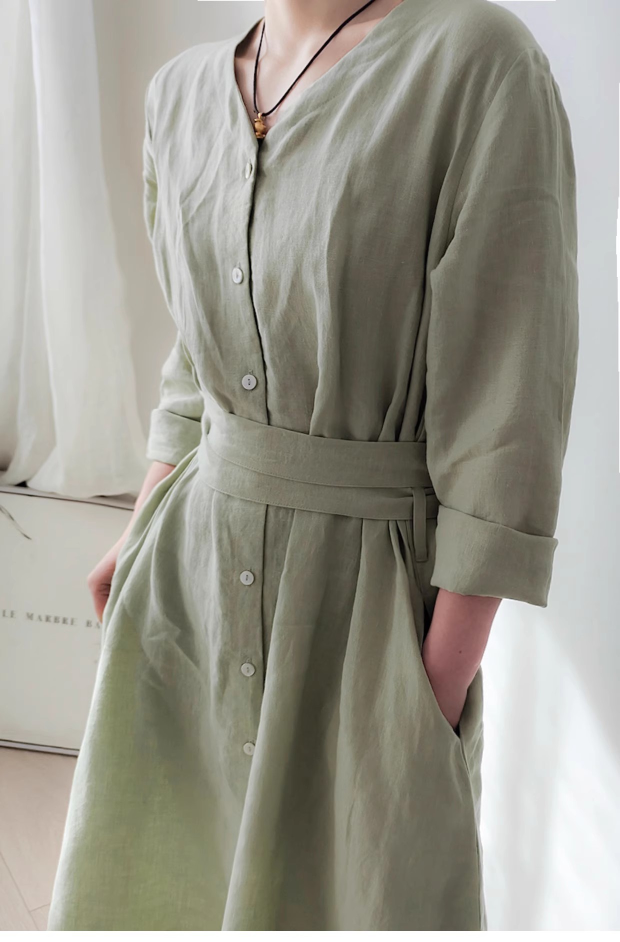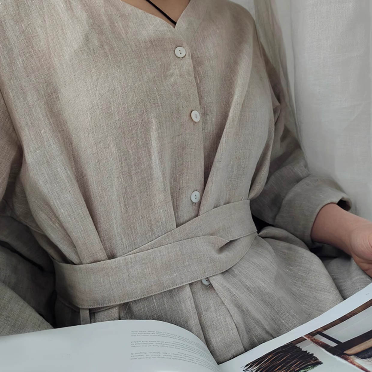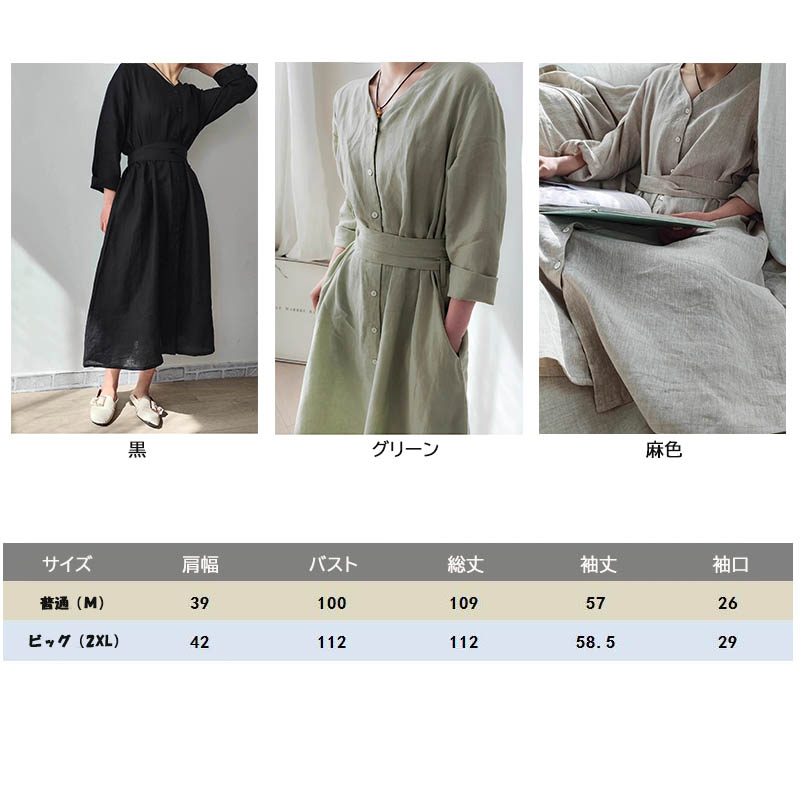■コメント ・ほどよいハリと柔らかさのありナチュラルな風合い。 ・顔周りをすっきりさせてノーカラーデザイン。 ・すとんと落ちる落ち感のある素材で細見えします。 ・ウエストリボンでシルエットに変化を持たせ脚長効果も期待できます。 ・ワンピースとしてはもちろん、ボタンを開けて軽めのコートとしても着用できます。 ■サイズ(単位:約cm) 画像に記載 ■カラー 画像に記載 ■伸縮性 なし ■裏地 なし ■生地の厚さ 普通 ■透け感 なし ■素材 ポリエステル100%