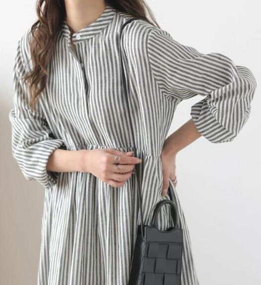 上品な縦縞ストライプ柄が魅力的なシャツワンピース。