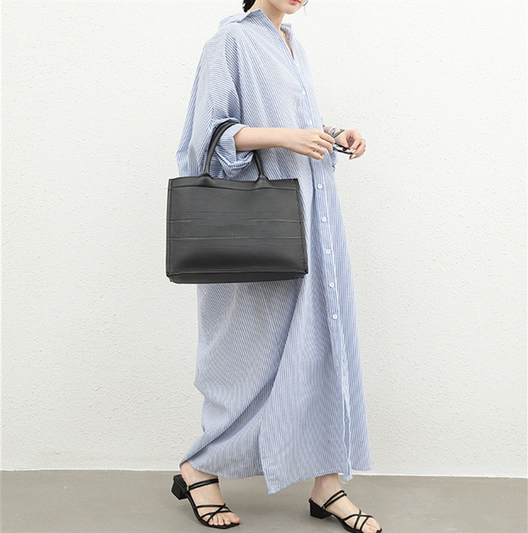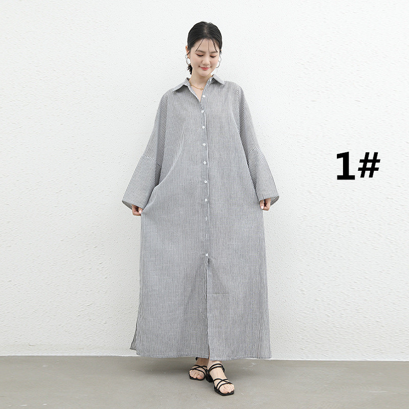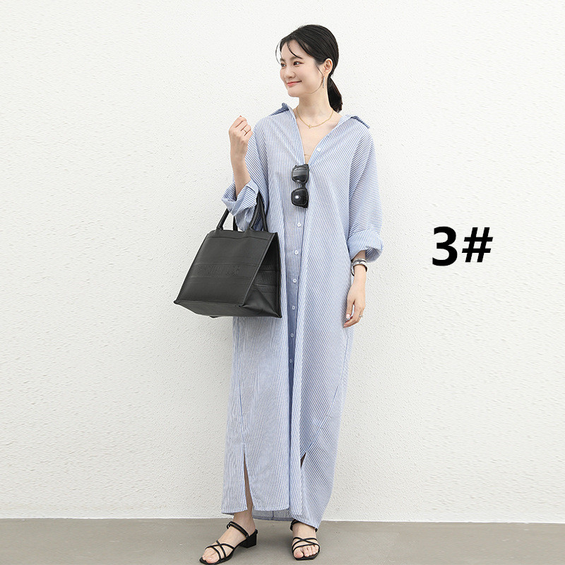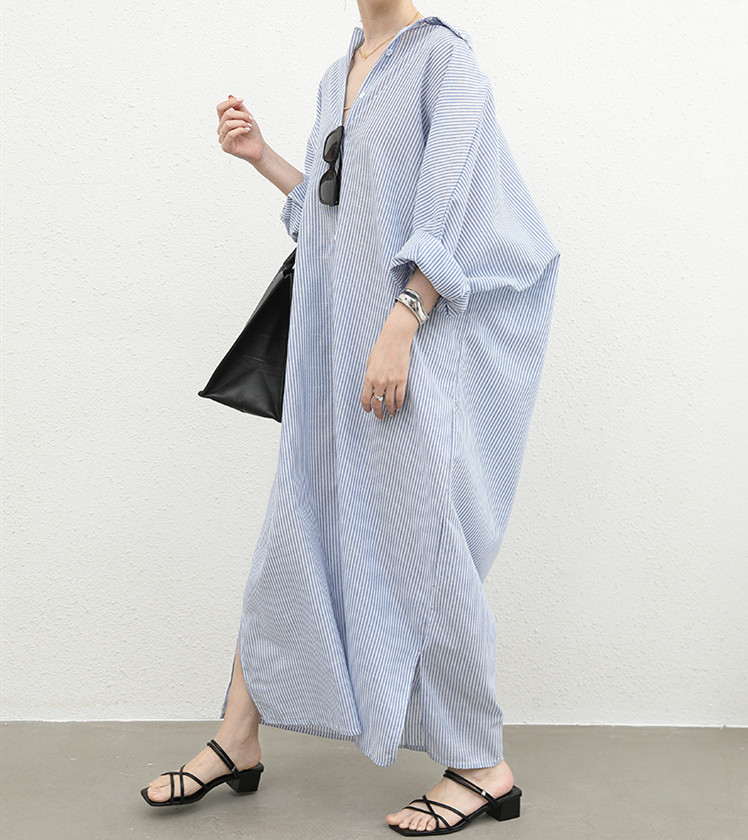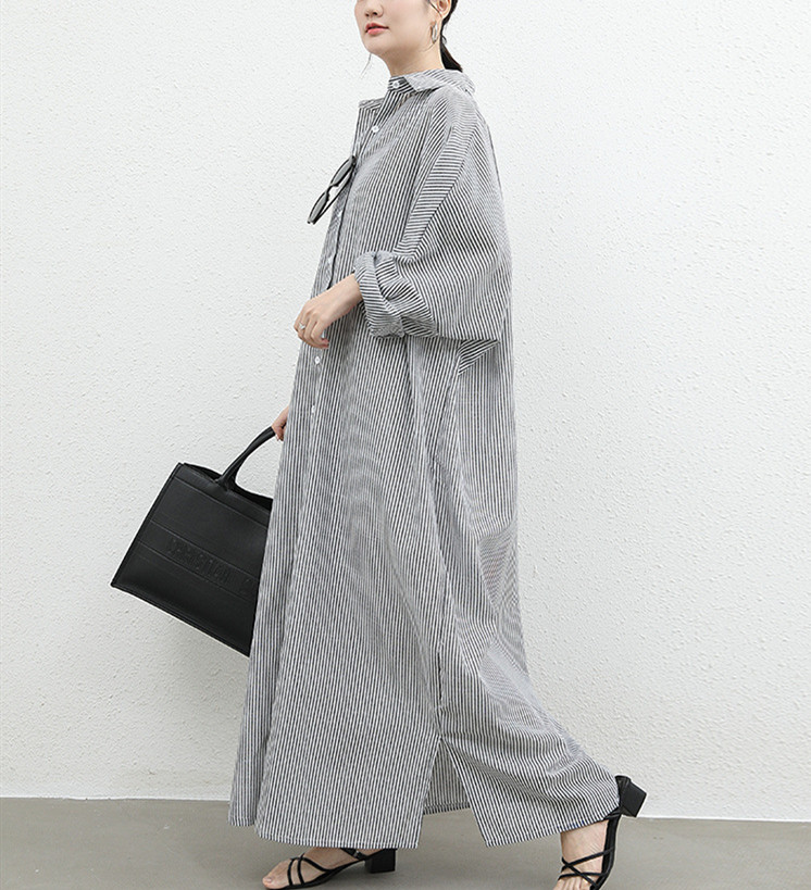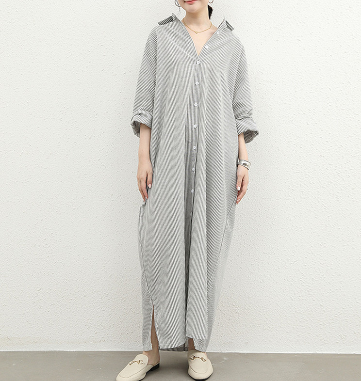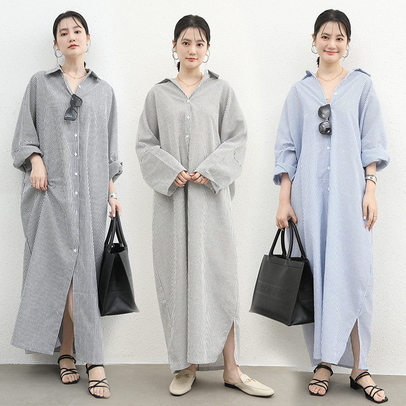 ゆったりとしたシルエットが魅力的なストライプ柄のロング丈シャツワンピース。